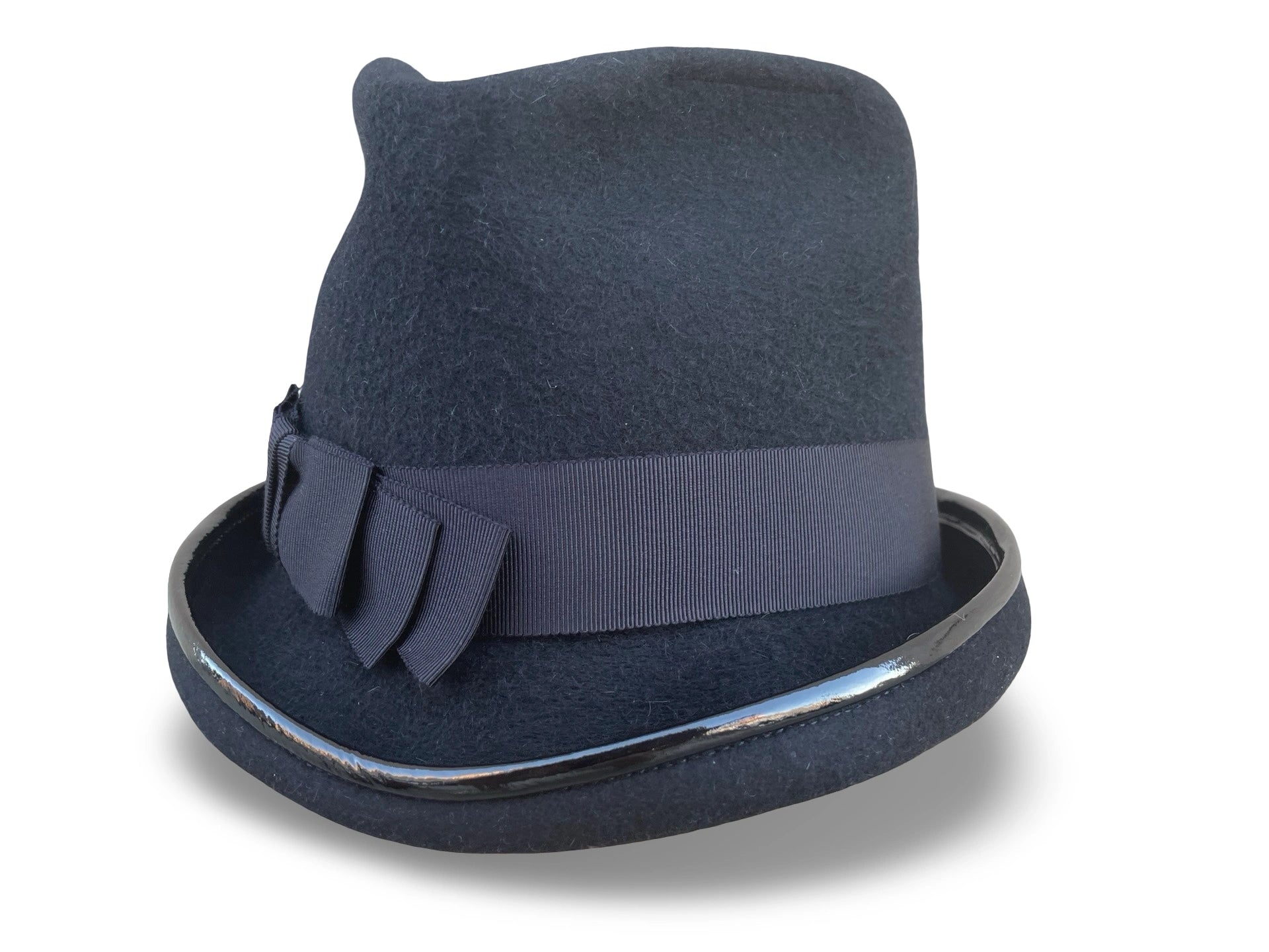 Handcrafted from premium black cashmere felt, this designer top hat embodies refined craftsmanship with a modern edge. The slouchy crown adds a relaxed, fashion-forward silhouette, while the asymmetrical brim gives the piece an artful, avant-garde attitude.